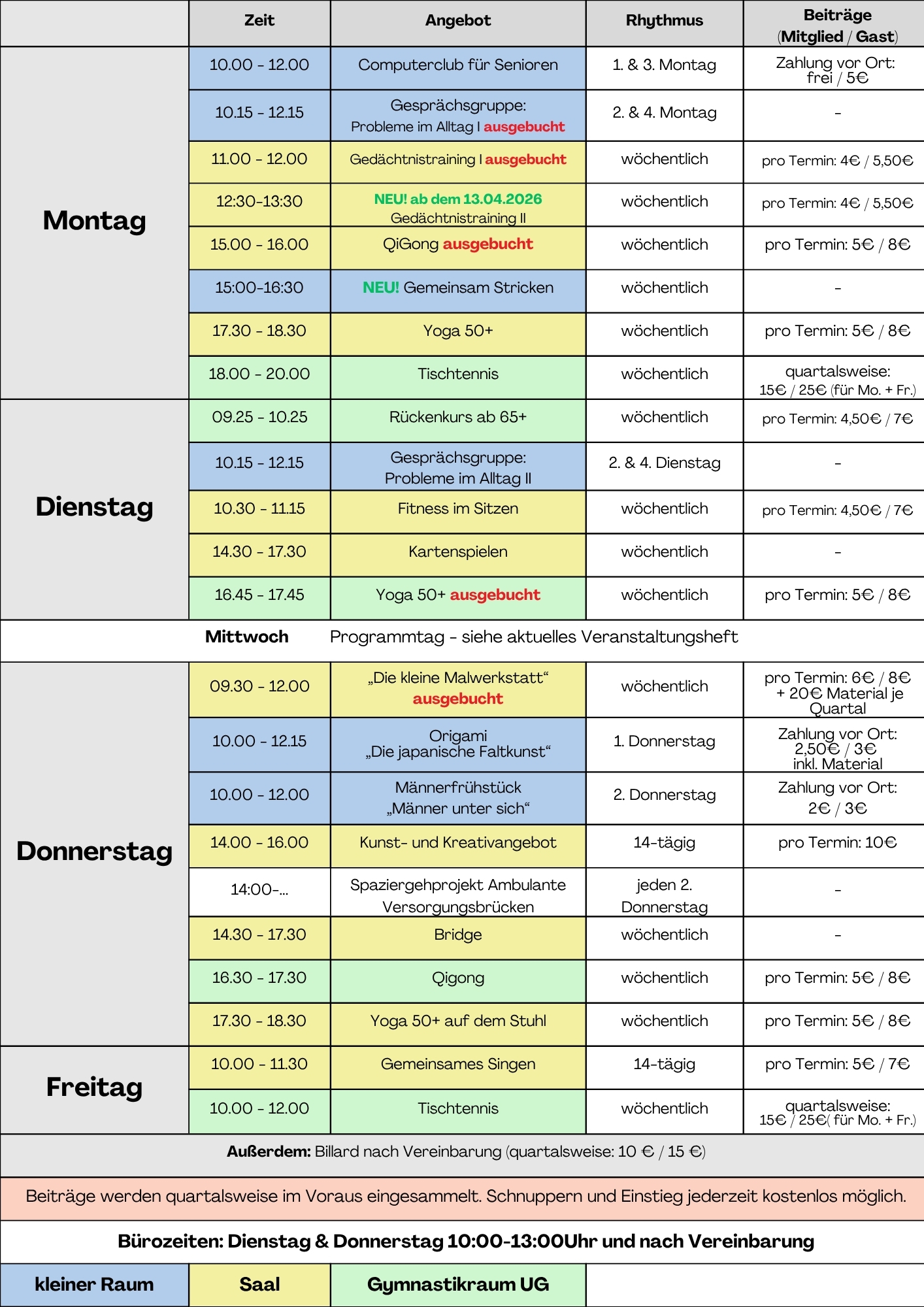 Der Verein hat es sich zur Aufgabe gemacht, einen Ort der Begegnung mit unterschiedlichen Angeboten für Menschen in der nachberuflichen Phase bereit zu stellen, unabhängig von Herkunft, Rasse, Religion u. politischer Einstellung.