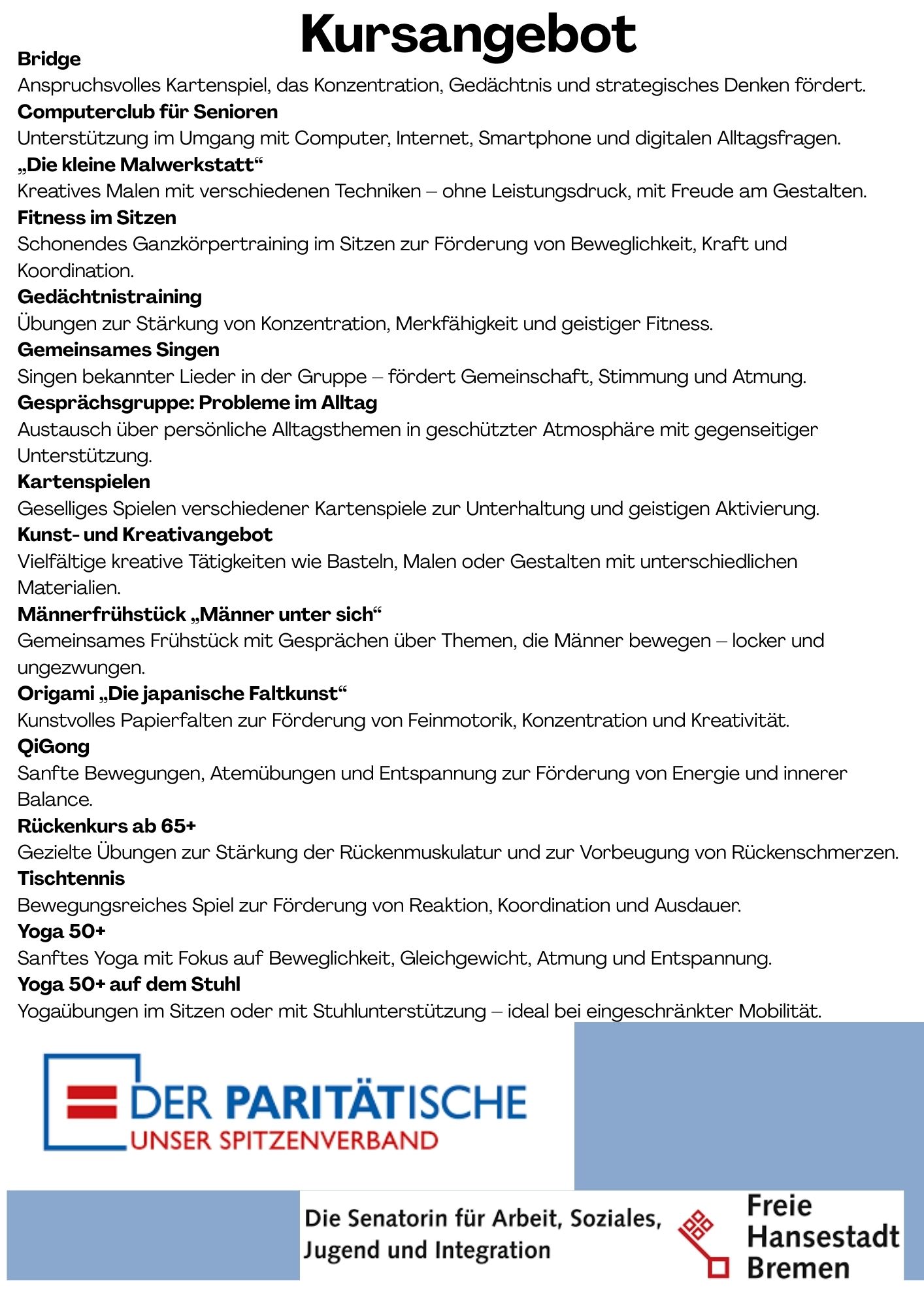 Der Verein hat es sich zur Aufgabe gemacht, einen Ort der Begegnung mit unterschiedlichen Angeboten für Menschen in der nachberuflichen Phase bereit zu stellen, unabhängig von Herkunft, Rasse, Religion u. politischer Einstellung.